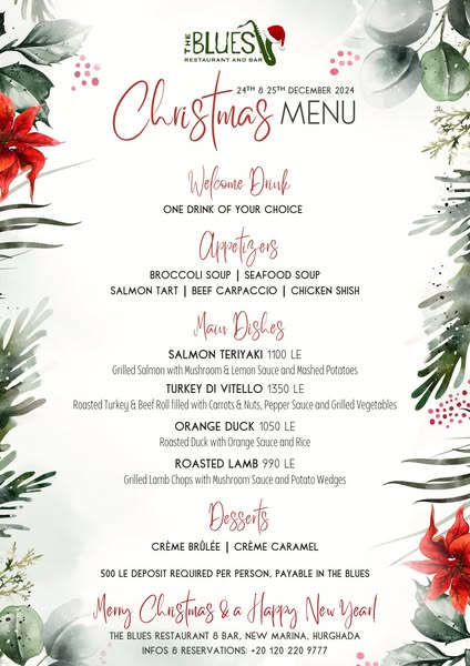 搜索关键词 Hurghada Marina Christmas, Christmas Dinner Egypt, Christmas Menu Hurghada, The Blues Restaurant Christmas, Festive Dining Hurghada, Christmas Eve Hurghada, Christmas Day Hurghada, Holiday Dinner Egypt, Christmas celebration, Family Christmas Dinner优势 Festive atmosphere,Delicious Christmas Menu,Convenient location in Hurghada Marina
