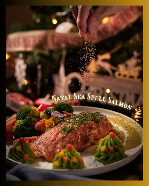 - Grilled Pacific Salmon with Mystical Garlic-Herb Butter, Side with Hand-picked Garden Vegetables, Mashed Potato with a Touch of Christmas Magic.