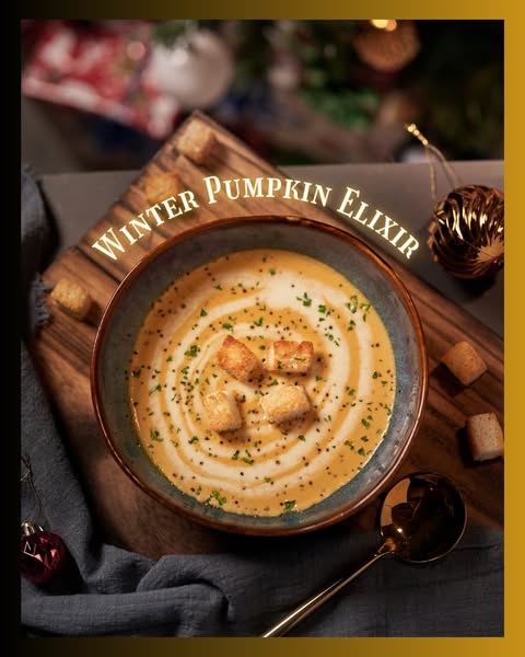 - Simmered Creamy Pumpkin Broth with Snowflakes of Spices and Herbs, Garnished with Crunchy Croutons.