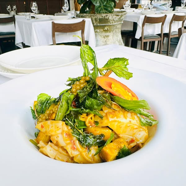 A fiery stir-fry of succulent squid tossed with fresh Thai eggplant, fragrant wild ginger, green peppercorn, kaffir lime leaf, and spicy curry paste.