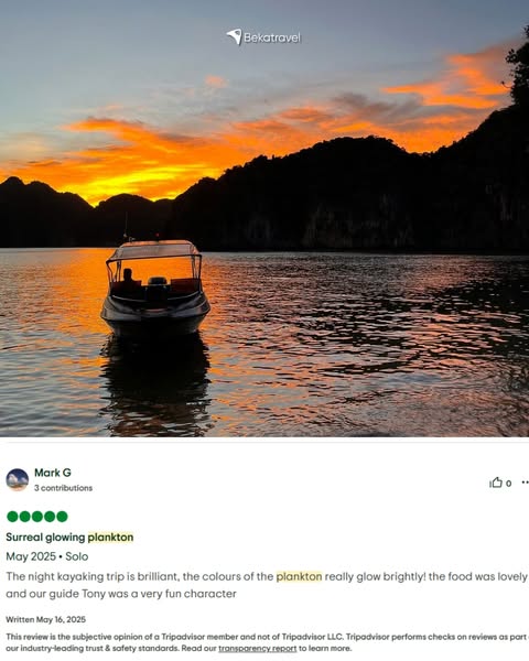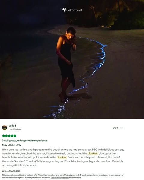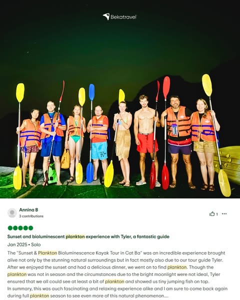 搜索关键词 Lan Ha Bay kayak, bioluminescent kayak tour, Vietnam adventure tour, BekaTravel discount, sunset kayak tour, Cat Ba island tours, limited time offer, local experiences Vietnam, magical half-day tour, kayak special offer优势 Positive customer testimonials,Exclusive 10% discount,Unique bioluminescent kayaking experience,Real local experiences