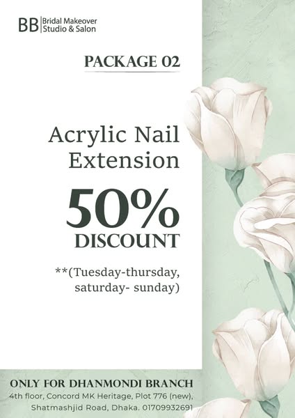 搜索关键词 salon services, beauty services, 50% off, hair services, skin care, nail care, spa treatments, Dhaka salon, luxury salon, Blush Diva优势 50% off all services,Wide range of services (hair, skin, nails, spa),Professional and experienced team,High-quality products and hygiene standards,Relaxing ambiance,Open 7 days a week