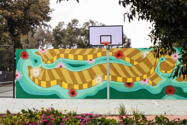搜索关键词 Robertson Park upgrades, North Perth netball, multi-sport courts, community recreation, local government projects, sports facility development, Western Australia sports, new basketball court, LED lighting sports, Tyrown Waigana artwork优势 New multi-sport courts,Fencing and LED lighting,Home of North Perth Dynamites Netball Club,Dual hit up wall and basketball half court,Brightly colored artwork
