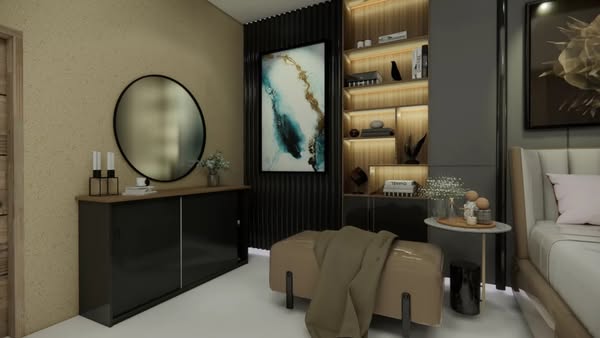 Step into a world of modern elegance with this beautifully designed bedroom. The combination of a plush bed, functional nightstand, and a striking mirror exemplifies the essence of contemporary interior design. 🏡💤