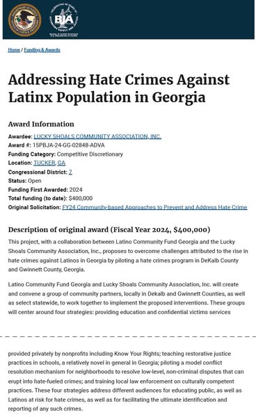 搜索关键词 Latino community, hate crimes, immigrant support, DOJ grant, LSCA nonprofit, community advisory boards, Gwinnett DeKalb, legal advocacy, crime prevention, social justice优势 Community-focused approach,Addresses a critical social issue,Collaboration with community advisory boards