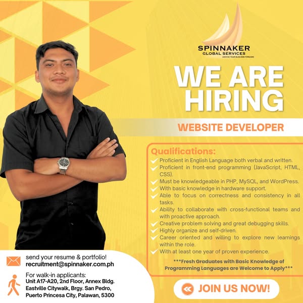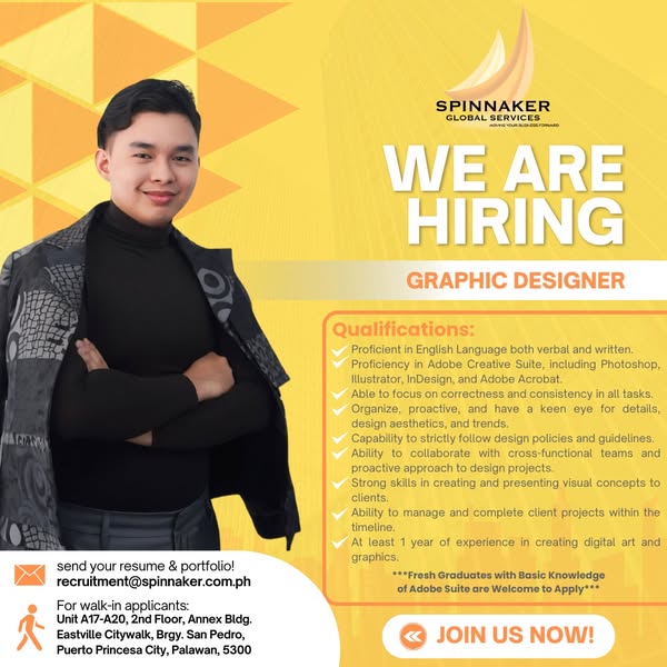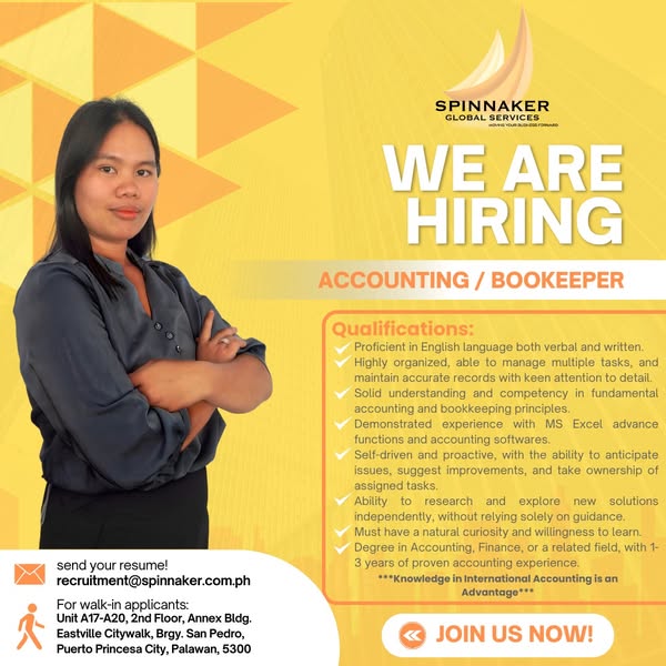 搜索关键词 Spinnaker Global Services, Job Hiring, Palawan Jobs, Marketer Position, Graphic Designer Jobs, Website Developer Vacancy, Accounting Bookkeeper, Career Move, Employment Opportunity, Build Amazing Together优势 Opportunity for growth,Values talent and passion,Variety of open positions