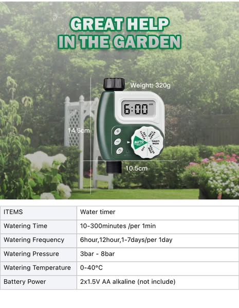 搜索关键词 automatic watering, watering timer, garden irrigation, automatic irrigation, watering system, battery powered timer, customizable watering, gardening tools, plants watering, easy watering优势 Automatic timer settings,Customizable watering duration,Adjustable watering frequency,Weather resistance,Battery powered,One year warranty