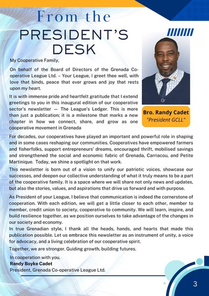 搜索关键词 cooperative league newsletter, league ledger publication, grenada cooperatives, carriacou petite martinique, supporting strong cooperatives, guiding growth, first quarter activities, president message, general manager update, community news优势 Stay connected and informed about cooperative activities.,Provides updates from leadership.,Highlights activities during the first quarter.