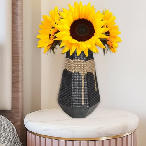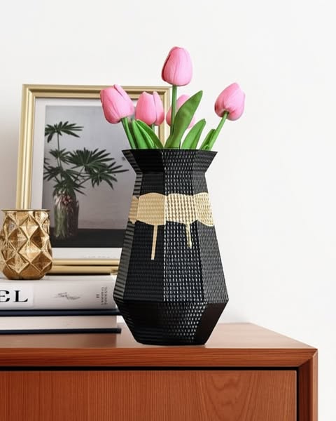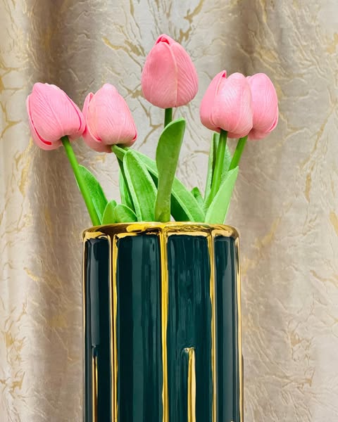 Color: Rich emerald green with shiny gold accents. Design: Features a beautiful vertical ribbed pattern, giving it a classic Art Deco look. Details: Finished with a polished gold rim and base for a touch of luxury. Use: Perfect as a statement piece or for holding flowers. Style: Adds a touch of vintage glamour and elegance to any room.
