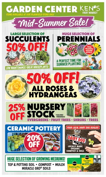 In our Plainfield Garden Center, the Mid-Summer Sale is going on and includes a variety of plants for you to choose from, featuring...