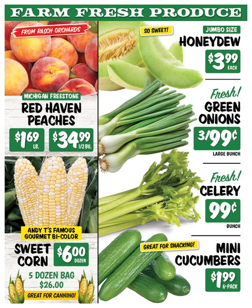 Here's a SNEAK PEEK of our SPECIALS for next week! 🍉 🍑 🌽 🥩 🍔 🌭