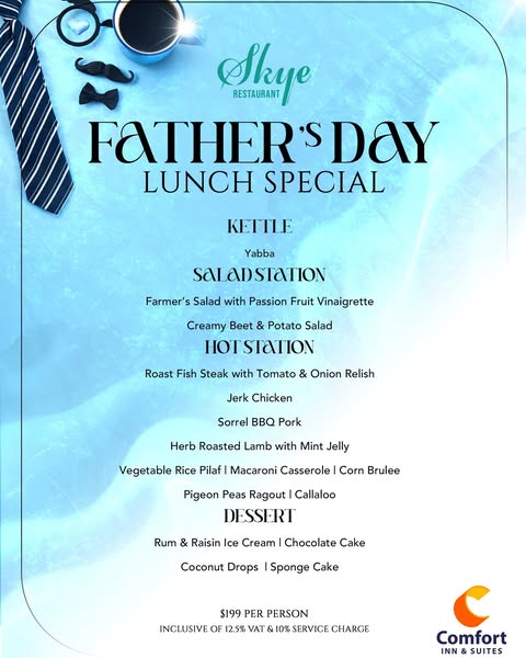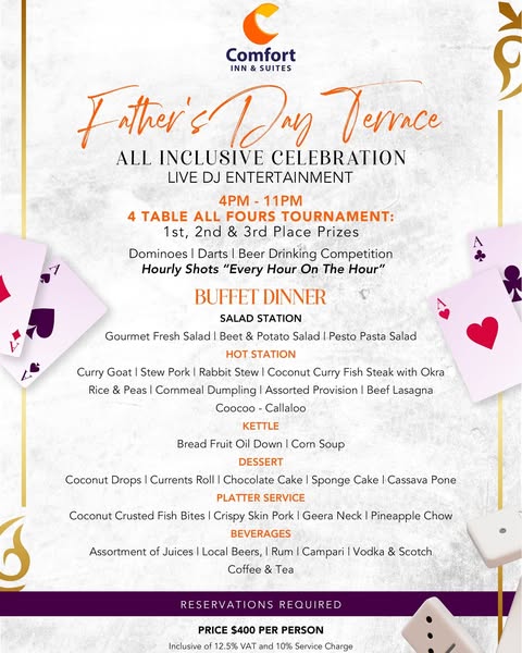 搜索关键词 Father's Day buffet, Comfort Inn Tobago, Terrace Lime, Father's Day celebration, All Fours tournament, Beer drinking competition, Fathers Day Special, Sunday Brunch, Weekend Special, Hotel promotions优势 Variety of meal options (breakfast, lunch, dinner),All-inclusive terrace event with entertainment,Convenient location and contact methods
