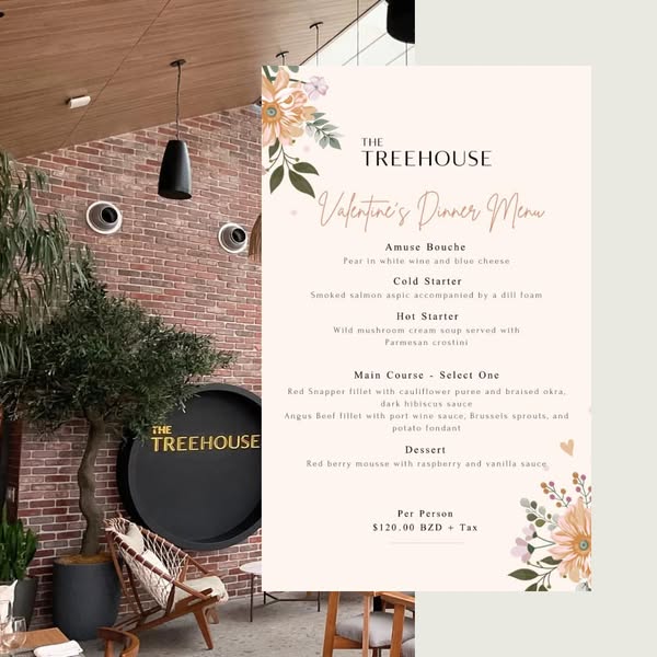 Enjoy a romantic 5-course plated dinner on Friday, February 14th, 2025, from 5:30 PM - 10:00 PM for just $120.00 BZD + taxes per person.