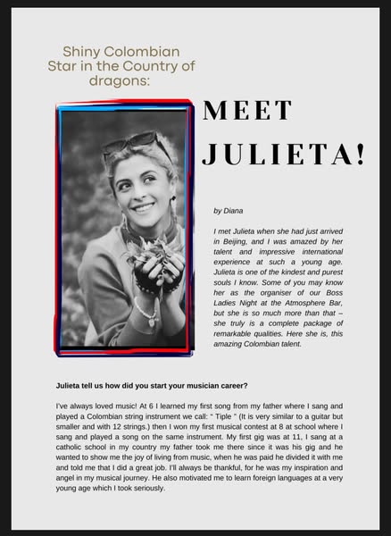 Quería compartirles esta hermosa revista en la cual salí el en enero como Boss Lady de Beijing de diciembre 2024. Me sentí muy orgullosa porque tuve el gusto de conocer y crear una amistad con una mujer colombiana ingeniera caleña Díana Vidal quien es la creadora de la