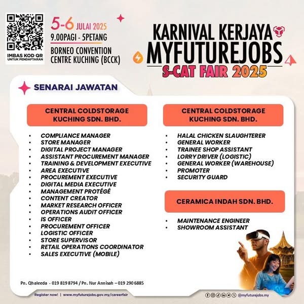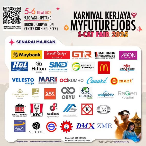 搜索关键词 Sarawak career fair, job vacancies Sarawak, MYFutureJobs Sarawak, S-CAT Fair 2025, job opportunities Kuching, TEGAS career, MEITD training, Borneo Convention Centre, career registration Sarawak, Sarawak job seekers优势 Wide range of job opportunities,Organized by reputable organizations (TEGAS & MEITD),Convenient location (BCCK),Easy registration process