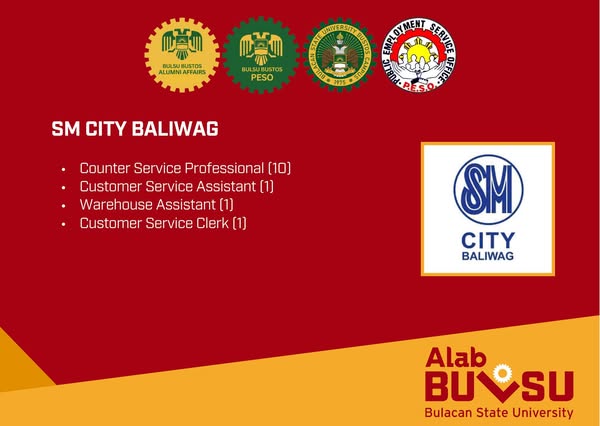搜索关键词 Job Fair Philippines, Bulacan Jobs, Government Services, Free Bank Account, Job Opportunities, BPI Jobs, SM CITY BALIWAG Jobs, CM PANCHO Jobs, ALTRADE MARKETING Jobs, PRU LIFE Jobs优势 One-stop shop for government services (SSS, Philhealth, Pag-ibig),Free bank account with ATM,Multiple job opportunities from various companies