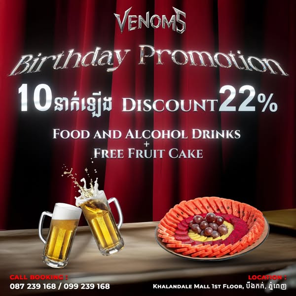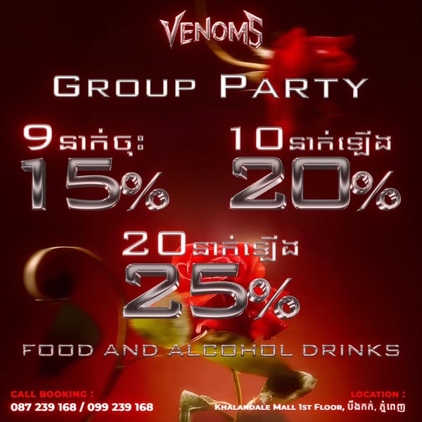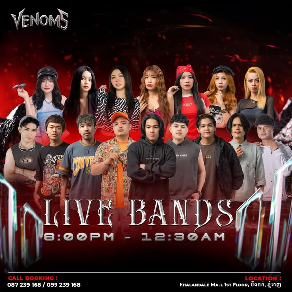 搜索关键词 Nightlife Phnom Penh, Venoms Club, Live Band, Group Discount, Birthday Promotion, Indoor Pub, Popular Club, Music DJ, Khalandale Mall, New Generation优势 Multiple discount promotions,Live band and DJ,Long operating hours,Popular venue