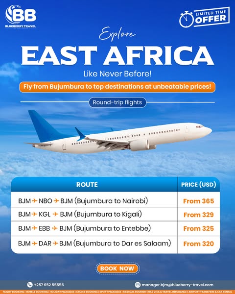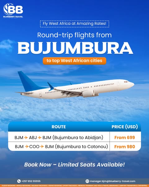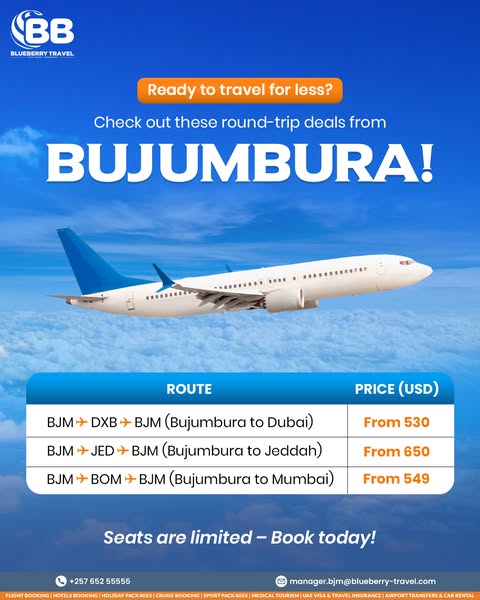 #BlueberryTravel #BujumburaFlights #TravelDeals #FlyFromBJM #AfricaTravel #MiddleEastFlights #EuropeTravel #BudgetFlights #ExploreMore #BookNow #blueberrytravelburundi #experiencebbt