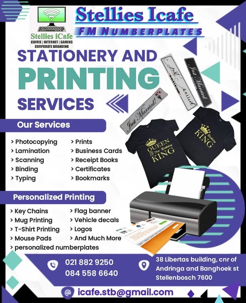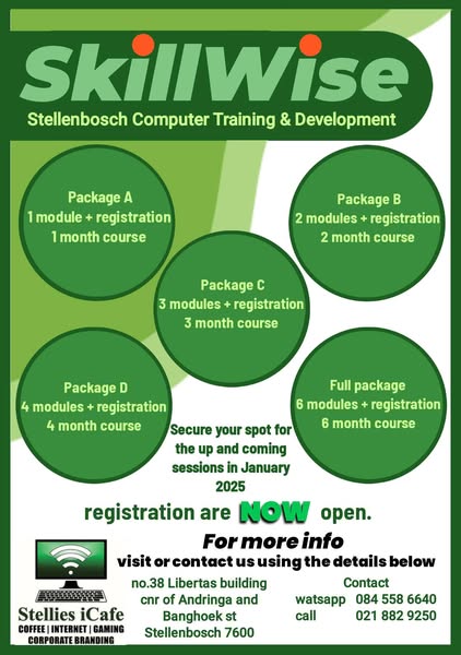 搜索关键词 web design services, computer training courses, printing services, Stellenbosch cafe, visa photo service, passport photo services, internet cafe services, graphic design branding, numberplates services, skillwise training优势 Wide range of services (training, design, printing),Convenient opening hours,Multiple contact options (phone, WhatsApp, email),Multiple services provided at the same location