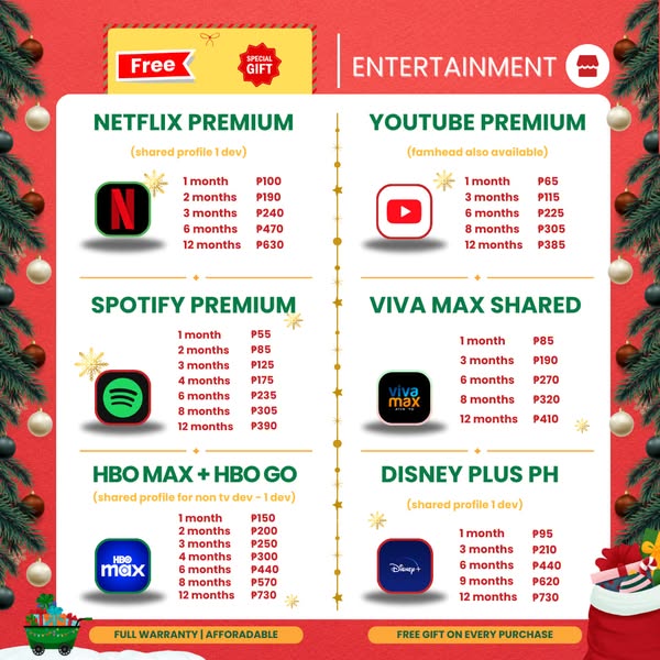 搜索关键词 premium subscriptions, holiday sale, netflix spotify, chatgpt plus, microsoft 365, evergreen institute, digital christmas, affordable subscriptions, entertainment learning, vpn services优势 Access to multiple premium digital services.,Affordable pricing (starting at ₱40).,Wide range of categories: entertainment, education, editing, VPN.