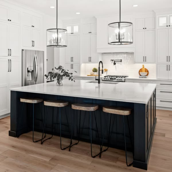 搜索关键词 white cabinetry, dark accents, kitchen design, home remodeling, modern kitchen, elegant kitchen, balanced colors, interior design, kitchen renovation, kitchen improvement优势 Elegant design,Modern aesthetic,Balanced color scheme