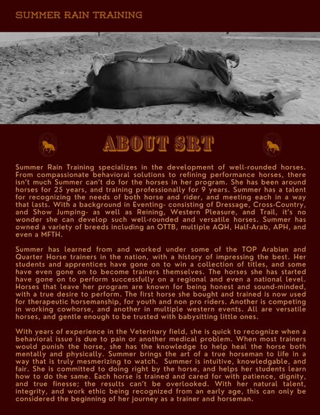 Anybody searching for a new trainer? I highly recommend Summer Rain Training (SRT) for anyone seeking an amazing trainer. Her program offers outstanding results, and she demonstrates a remarkable ability to connect with both horses and their handlers. I deeply admire her thoughtful and effective approach to training, which emphasizes patience, consistency, and a deep understanding of equine behavior. Summer’s expertise and dedication make her an invaluable resource for anyone looking to enhance their skills and build a stronger partnership with their horse.