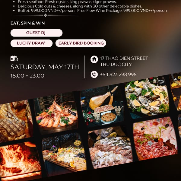 搜索关键词 Luxury buffet, Dinner buffet, The Gate restaurant, Australian beef, Italian cold cuts, Fresh seafood, Saigon dining, Thao Dien Restaurant, Live music, Restaurant and Lounge优势 Premium Australian Beef,Authentic Italian Cold Cuts and Cheeses,Fresh Seafood,Special Guest DJ,Early Bird Discount,Lucky Draw