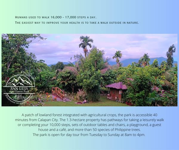 搜索关键词 agriforest park, nature park, family outing, outdoor activities, san luis, oriental mindoro, mindoro tourism, park opening, nature tourism, farm park优势 Affordable entrance fee,Quiet time with nature,Hearty meals available,Outdoor activities for kids,Luscious pathways