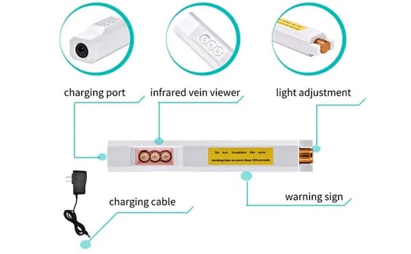 1️⃣ تقنية LED عالية الطاقة: مصباح LED أحمر فريد من نوعه للكشف بسهولة عن الأوردة تحت الجلد.