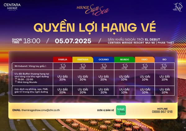 搜索关键词 The Mirage Show, Bui Anh Tuan tickets, Thanh Ngoc concert, Mui Ne event, Centara Mirage Resort, Vietnam live music, Live music show, Vietnamese singers, Concert in Vietnam, Resort show优势 Features popular Vietnamese singers Bùi Anh Tuấn and Thanh Ngọc,Exclusive perks with each ticket tier,Takes place at a 5-star resort,Offers Emotion-packed performances and explosive collabs,Show included dynamic live band bringing every beat to life