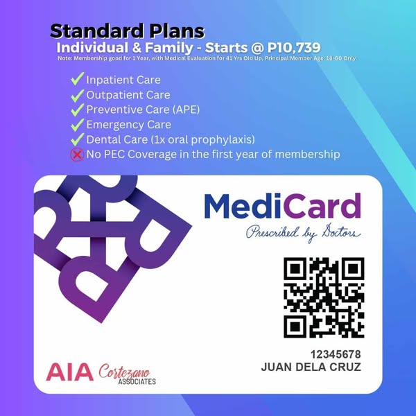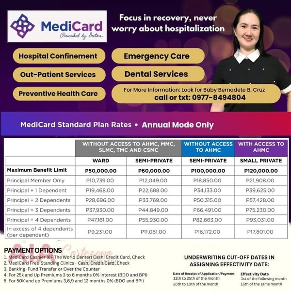 搜索关键词 cashless healthcare, health insurance, HMO plans, medicard benefits, annual physical exam, emergency care, payment options, medical assistance, licensed account officer, affordable healthcare优势 Cashless transactions,No upfront payments at partnered hospitals/clinics,Various HMO plans (Standard & VIP),Annual Physical Exam (Standard),Executive Check-up (VIP),Inpatient, Outpatient, Emergency, & Dental Care,Installment payment options (BDO & BPI)