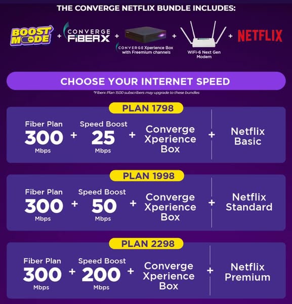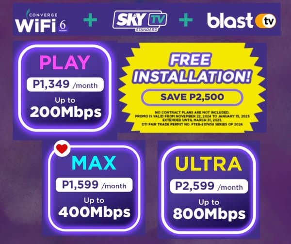 搜索关键词 Converge FiberX, internet plans, fiber internet, affordable internet, Philippines internet, high speed internet, netflix bundle, Wifi 6 modem, SkyTV Box, Blast TV优势 High-speed internet access,Affordable plans,Free installation,Bundled services (WiFi 6, SkyTV, Blast TV, Netflix)
