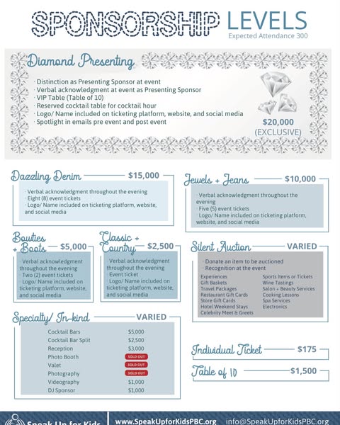 搜索关键词 Foster Children Support, Palm Beach Charity, Denim Diamonds Gala, Fundraising Event, Charity Event Florida, Kids Support Program, Child Welfare Donation, Community Fundraising, Glamorous Charity Event, Speak Up For Kids PBC优势 Supports foster children in Palm Beach County,Glamorous event for a good cause,Opportunity to become a sponsor or donor