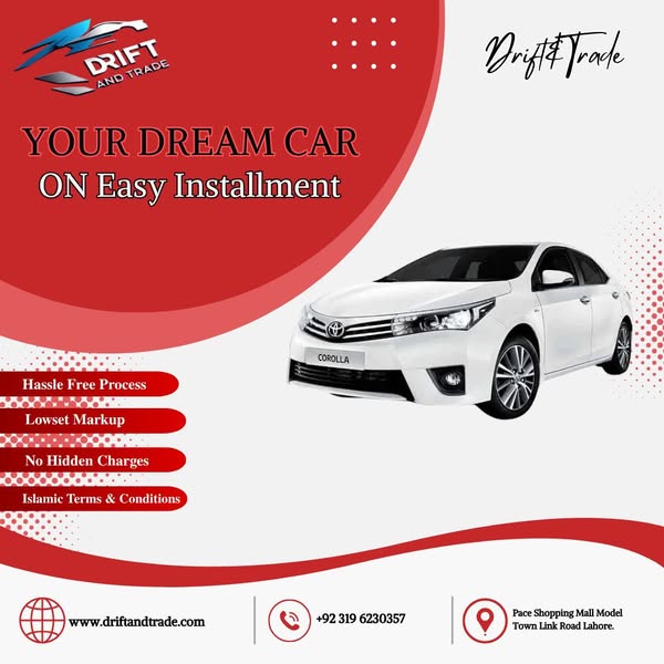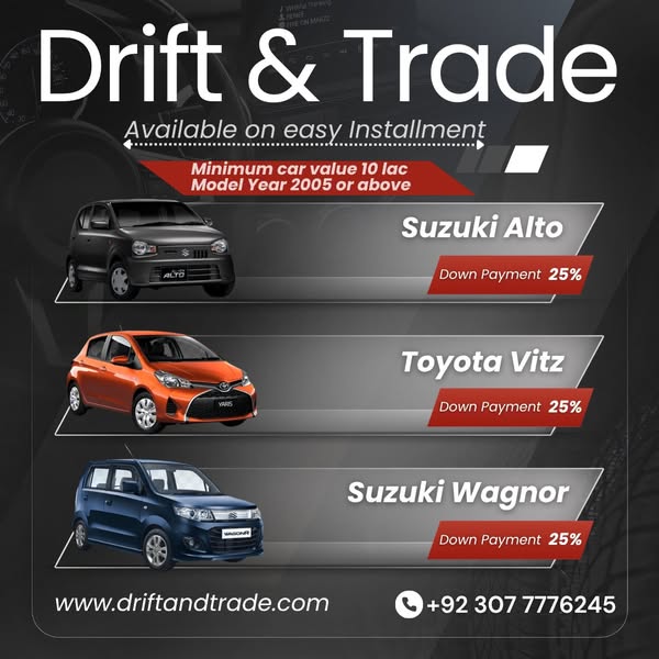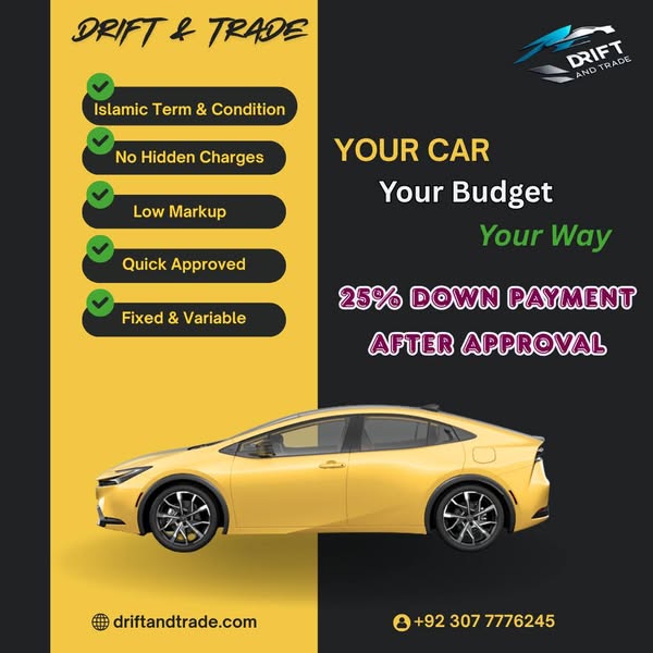 Drift & Trade (PVT) LTD offers hassle-free car financing with low down payments, flexible monthly installments, and fast approvals. Trusted for 7+ years across Pakistan!