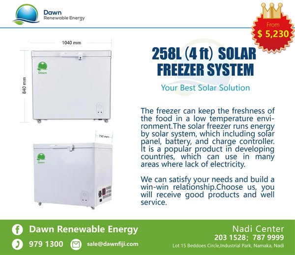 搜索关键词 solar freezer, renewable energy, fiji solar, off-grid refrigeration, sustainable cooling, solar powered freezer, rural refrigeration, energy conservation, dawn solar fiji, 258L solar freezer优势 Fully solar powered,Large capacity,Efficient refrigeration,Low maintenance,Suitable for remote areas