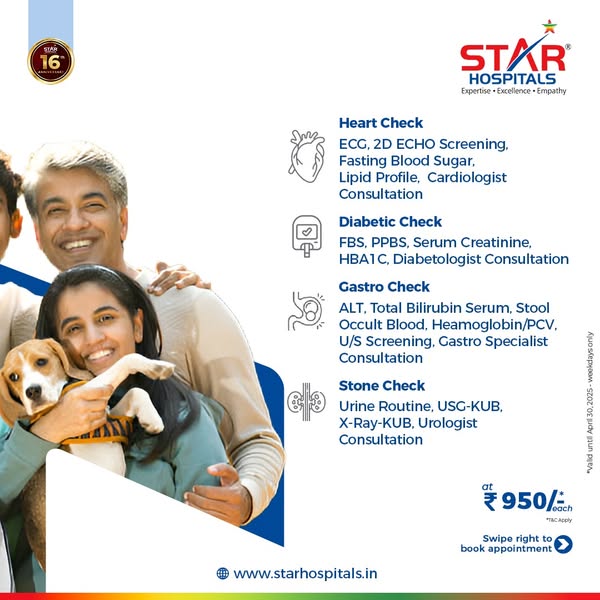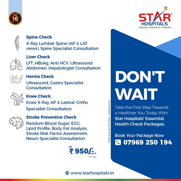 Secure a healthier tomorrow by investing in your well-being today. Avail our quick health checks for spine, liver, hernia, knee, and stroke. Start your journey to a healthier future today.