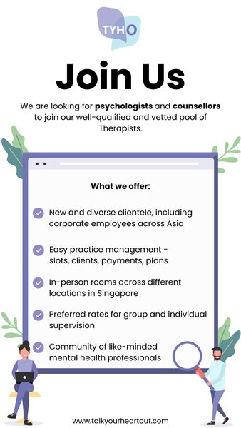 Are you looking to grow your practice with flexible work hours and easy client management? Join Talk Your Heart Out (TYHO) and offer sessions online or in-person at one of our many TYHO Rooms across Singapore. If you're passionate about helping others lead fulfilling and happy lives, we’d love to hear from you!