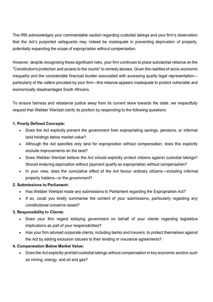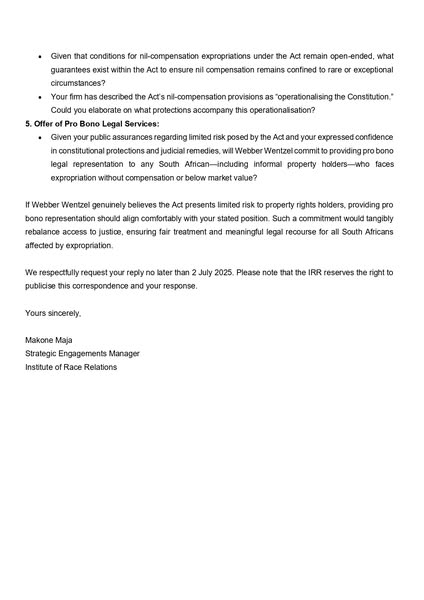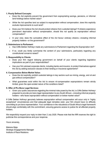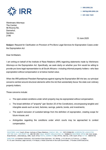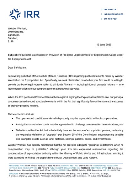 📢 The IRR asks SA’s Top Law Firms: If expropriation without compensation is “rare” and “protected by law,” will you offer pro bono help to those hit hardest?