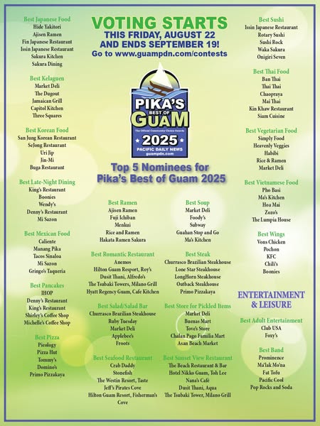 Drum Roll, Please. Here are your Top 5 Nominees in Pika’s Best of Guam 2025. Voting starts this Friday, August 22 and ends September 19, 2025. Go to