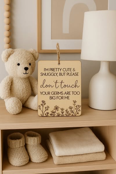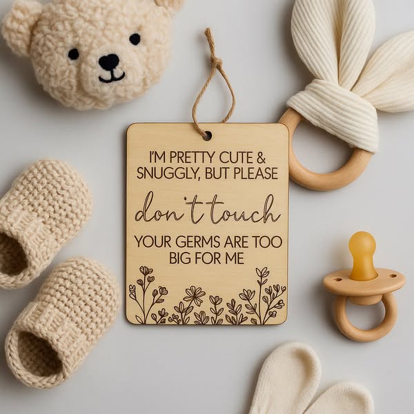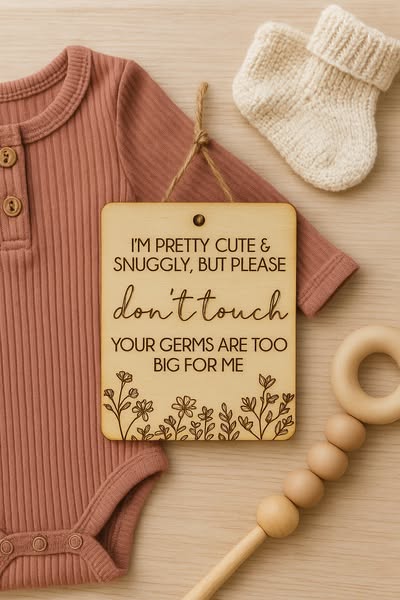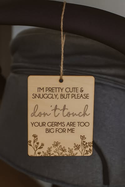 Perfect for prams, car seats, or baby carriers – our laser-engraved wooden sign gently reminds others to admire from afar. Made from natural wood with a beautifully floral design, it’s the cutest (and kindest) way to keep unwanted germs at bay.