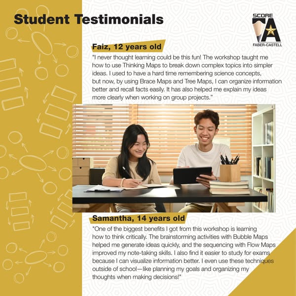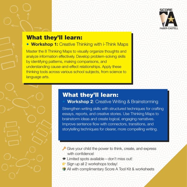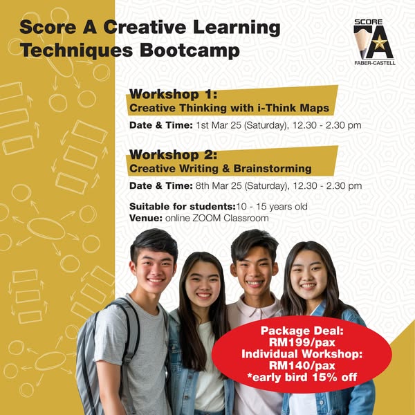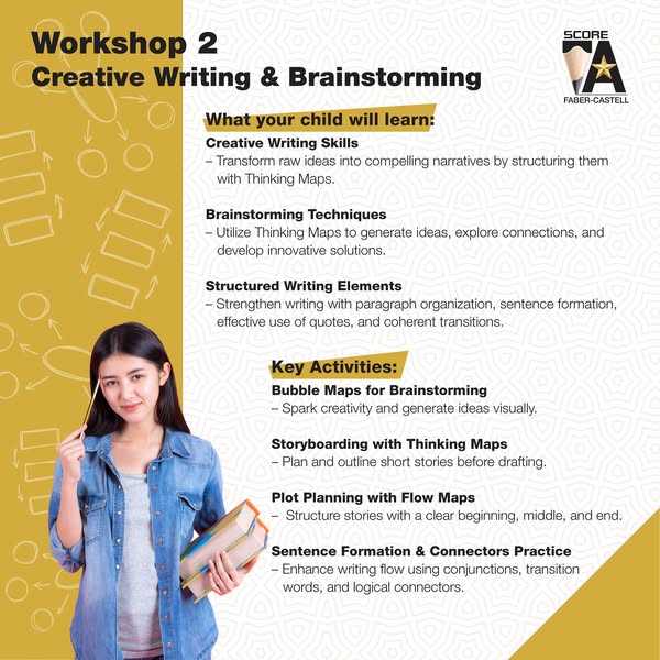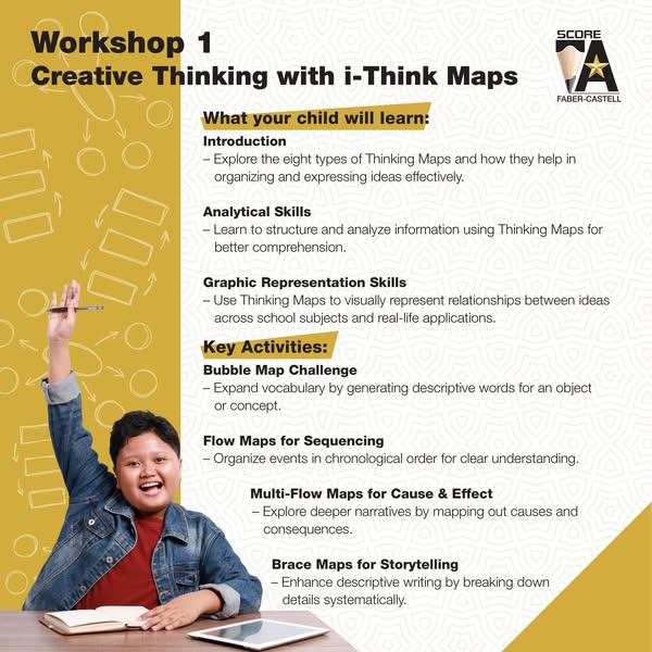 搜索关键词 creative writing skills, children writing workshop, i-think maps learning, faber castell workshop, online zoom classroom, early bird discount, critical thinking development, improve writing skills, creative brainstorming, child education enrichment优势 Develops critical thinking skills,Improves writing confidence,Fun and interactive learning,Uses i-Think Maps for creative thinking