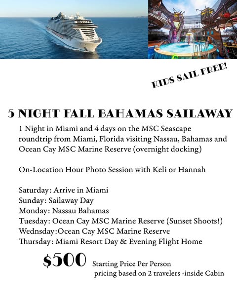 搜索关键词 Bahamas cruise, photoshoot vacation, travel photography, sunset photography, private island photoshoot, professional photographers, travel portraits, destination photoshoot, fall getaway, ocean cay优势 Exclusive on-location photoshoot on a private island,Professional photographers (Keli & Hannah),Stunning sunset shoot opportunity,Retouched digital images included,Small group size, fun atmosphere