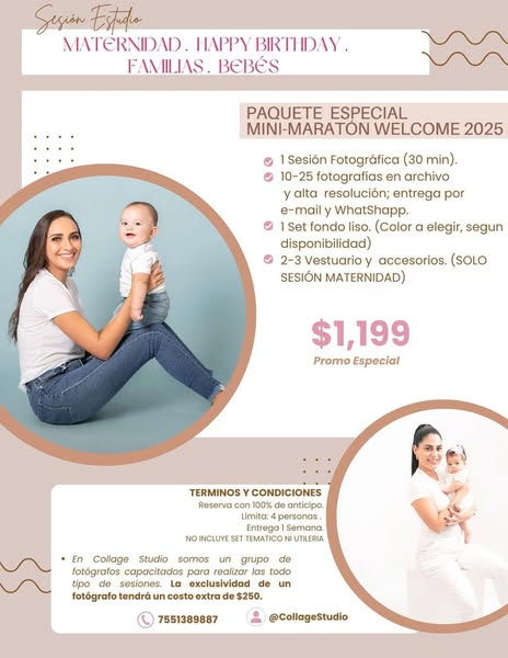 Esta promoción aplica para Sesion de maternidad en Studio , para Sesion Happy Birthday, para Sesion familiar y para bebés de 9 a 12 meses (o que ya se sienten).