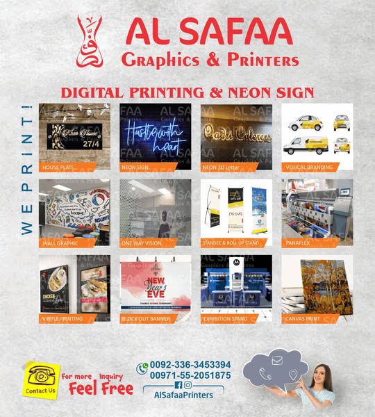 搜索关键词 printing services, acrylic display, vinyl branding, media walls, shield and medals, panaflex printing, oneway vision, standees design, UAE printing, al safaa printers优势 Wide range of printing and branding services,Contact information provided