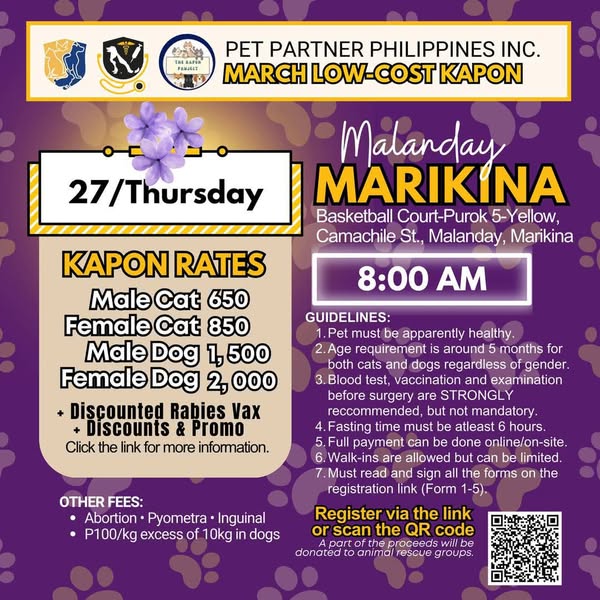 搜索关键词 low cost kapon, community neutering, Philippines vet service, dog neutering, cat neutering, metro manila vet, marikina vet, doc gab veterinarian, pet care, women's month raffle优势 Low-cost neutering services,Community event in convenient locations,Supports National Women's Month with raffle prizes,Includes injectable/oral medications