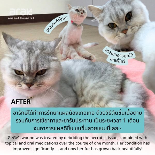👩⚕️ ทีมสัตวแพทย์โรงพยาบาลสัตว์อารักษ์ ได้ทำการตรวจรักษา ด้วยวิธีการตัดชิ้นเนื้อที่ตาย ร่วมด้วยการใช้ยาทาและยารับประทาน เป็นระยะเวลาประมาณ 1 เดือน จนแผลอักเสบมีอาการดีขึ้น ทำให้น้องเกอเกอกลับมามีขนนุ่มฟูน่ารักอีกครั้ง~
