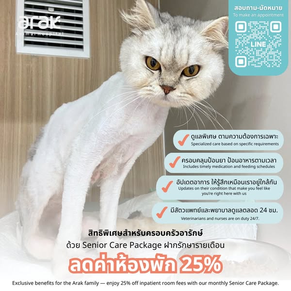 เคสฝากรักษาระยะยาว (รายเดือน) แบบนี้ ที่อารักษ์ก็มีแพ็กเกจพิเศษ! อย่าง Senior Care ช่วยลดค่าห้องพักรักษาถึง 25% เลยนะคะ อ่านรายละเอียดเพิ่มเติมได้ที่ 👇