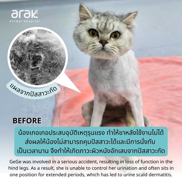 🐱 #เคสนี้ที่อารักษ์ น้องแมวเกอเกอ ประสบอุบัติเหตุพลัดตกจากตึกสูง ทำให้ขาหลังใช้งานไม่ได้ และได้มีการผ่าตัดจากที่อื่นมาก่อนหน้านี้ แต่ยังไม่สามารถกลับมาเดินได้ตามปกติ ประกอบกับมีอาการควบคุมปัสสาวะไม่ได้ และนั่งทับเป็นเวลานาน ส่งผลให้เกิดการอักเสบ จนกลายเป็นแผลปัสสาวะกัดที่ค่อนข้างลึก ตามที่เห็นในภาพ