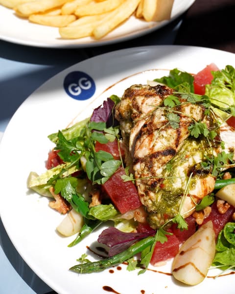 🍽️ GRILLED CHICKEN & WATERMELON SALAD with toasted walnuts, poached apple, asparagus, fresh herbs and balsamic glaze