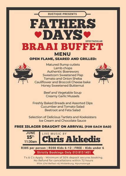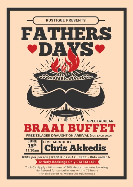 搜索关键词 Father's Day, Braai Buffet, Rustique Hotel, Live Music, Family Event, South Africa, Restaurant Promotion, Beer Special, Limited Seating, June 2025优势 Festive Atmosphere,Live Music,Free Beer for Dads,Family-Friendly Pricing